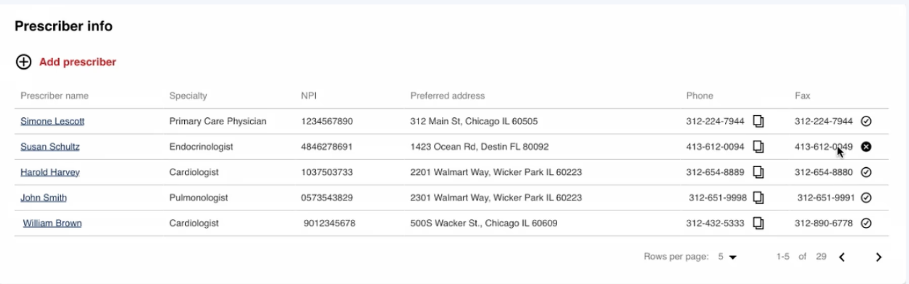 Faxing status was crucial, so we implemented check and x buttons to signify on and off status. One user stated they had a hard time decerning the color, so the check mark was changed to green.